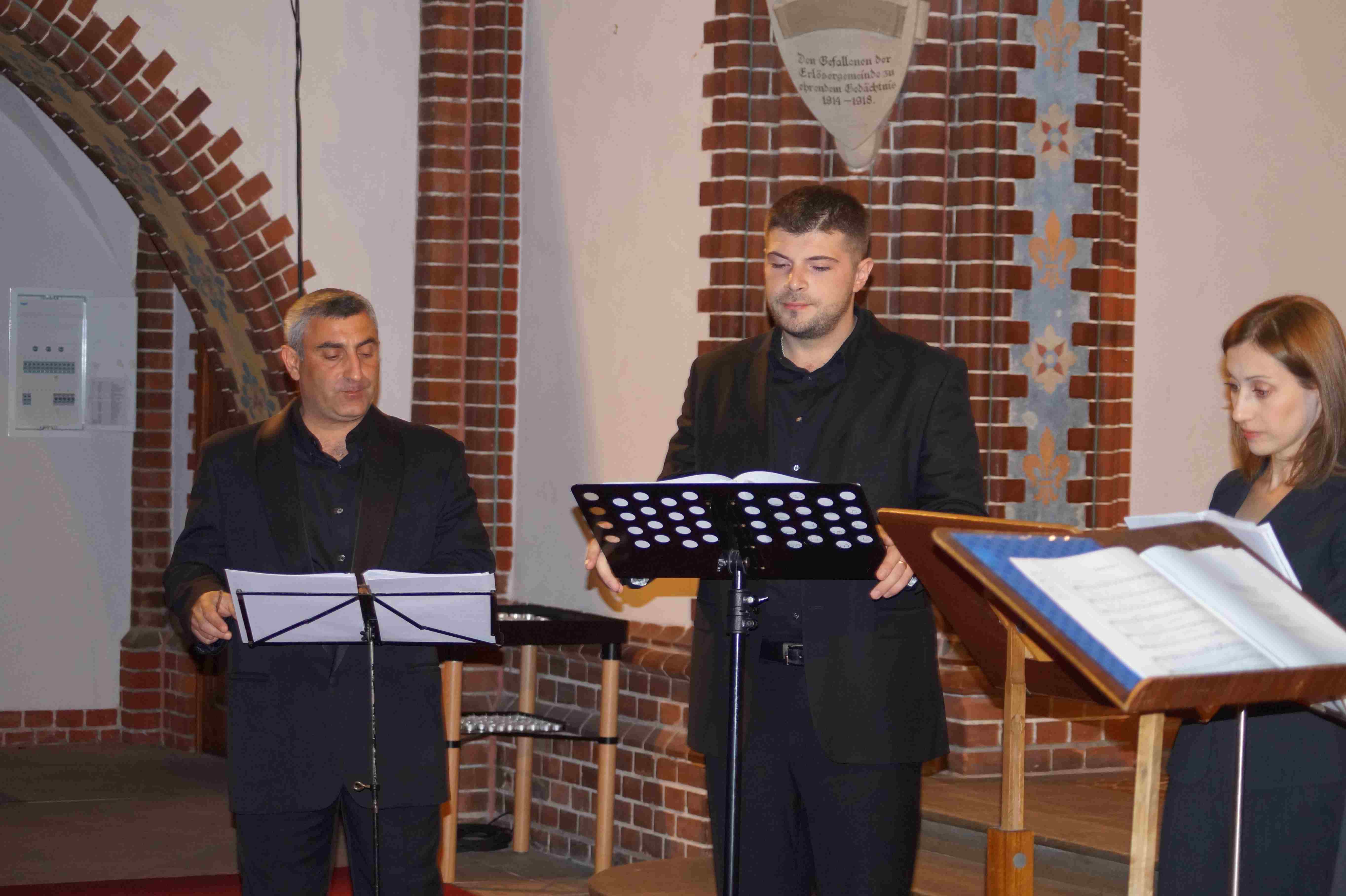 ՀԵՄԱ հ/կ Առաջին Նախագահի ողջույնի և Պաուլ Գերհարդի անվան Ավետարանական եկեղեցուն ուղղված երախտագիտության խոսքից հետո՝ տան տիրոջ ջերմ ընդունելությամբ ելույթ ունեցավ ավետարանական եկեղեցու գերապատվելի Յոախիմ Ցիրպկան։ <<Հավատակից սիրելի հայ քույրեր և եղբայրներ, համերգի սիրելի այցելուներ, ես նույնպես սրտագին ողջունում եմ Ձեզ այս երեկոյի կապակցությամբ։ Ուրախ ենք և մի փոքր էլ հպարտ, որ Դուք կանոնավոր կերպով հյուրընկալվում եք մեզ մոտ։ Դուք եկեղեցու ծածքի տակ եք և դրանով մեր արմատների մի անքակտելի մասը, իսկ բոլոր տարբերությունները հաշվի առնելով՝Դուք նույնպես այն սովորույթի մի մասն եք կազմում, որը մեզ կապում է տեր Հիսուս Քրիստոսի հետ>>,- նշեց գերապատվելի Ցիրպկան իր ելույթում, ապա անցավ 100 տարի առաջ Մեծ Եղեռնի ժամանակ հայ ժողովրդի կրած տառապանքներին, որը նաև գերմանական մեղսակցության արդյունք էր։ <<Այն հնարավոր չէ չեղյալ համարել, բայց կարելի է մշակույթի փոխանակման միջոցով միմյանց ավելի լավ հասկանալ, որպեսզի անցյալի վերքերը միասնաբար ավելի հեշտությամբ ու արագ ամոքել>>,-ասաց գերապատվելի Ցիրպկան։ Այնուհետև հետևեց <<ՍԱՆԿՏՈՒՍ>> համույթի ակապելլա ելույթը երգիչ-երգչուհիների հետևյալ կազմով.
